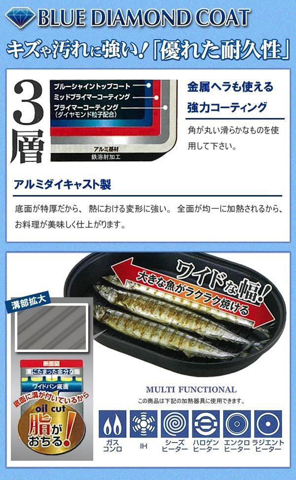 金属ヘラも使える強力コーティング。ブルーダイヤモンドコートにより、耐久性に優れています。アルミダイキャスト製で熱による変形に強い!食材が均一に加熱されるから、お料理が美味しく仕上がります。 |