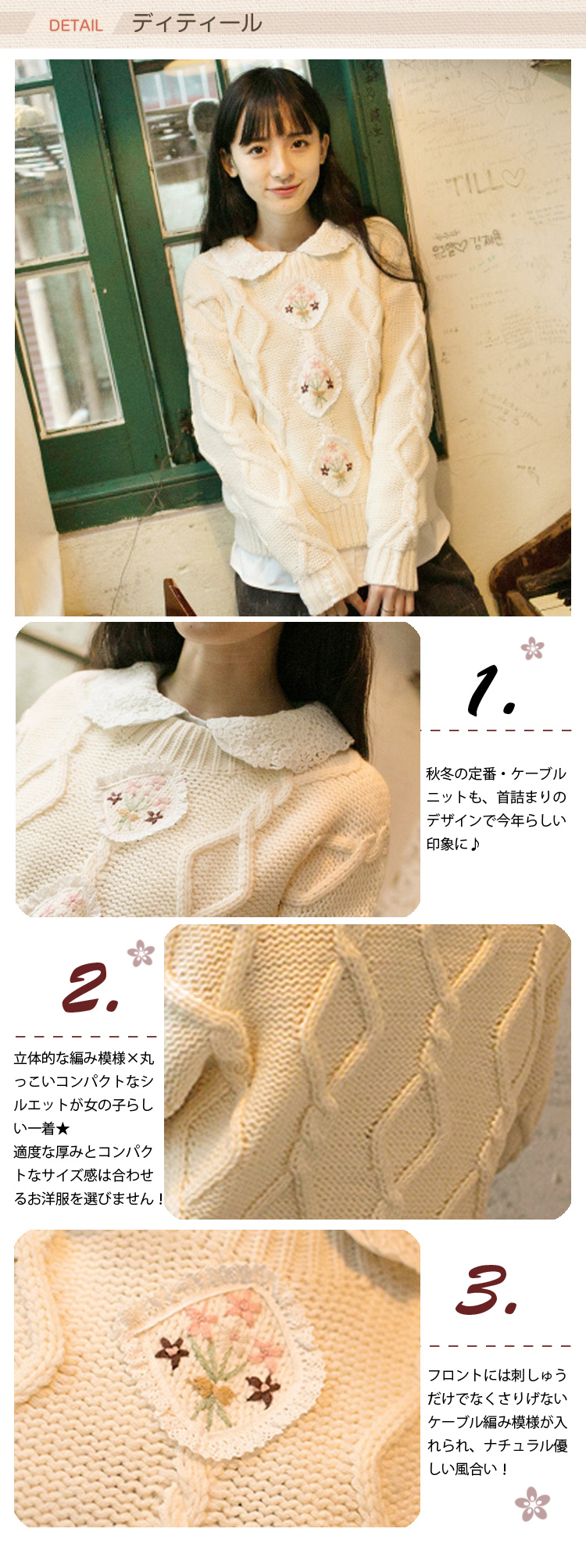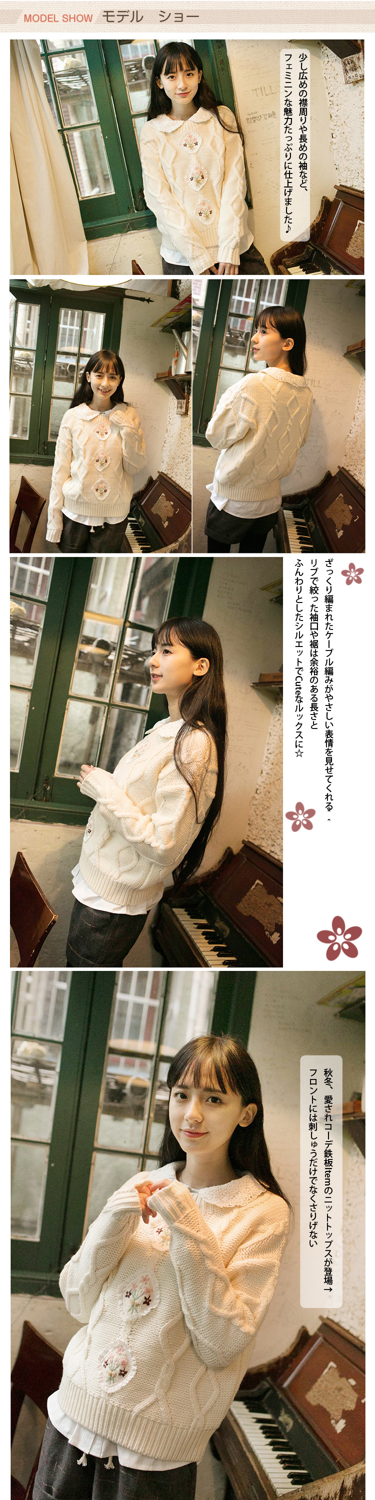 | 秋冬、愛されコーデ鉄板Itemのニットトップスが登場↑フロントには刺しゅうだけでなくさりげないケーブル編み模様が入れられ、ナチュラル優しい風合い!ざっくり編まれたケーブル編みがやさしい表情を見せてくれる^^リブで絞った袖口や裾は余裕のある長さとふんわりとしたシルエットでCuteなルックスに☆少し広めの襟周りや長めの袖など、フェミニンな魅力たっぷりに仕上げました?シャツと合わせて綺麗めコーデや、カットソーなどと合わせてカジュアルに着こなすのもオススメです。 | |