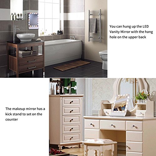 - WALL MOUNT OR TABLE TOP OPTIONS - With a Hanging Hole on the Upper Back and an Adjustable Stand, This LED Vanity Mirror Allows You to Hung It up or Sit to Make up According to Your Demands. The Fold out Stand Folds into the Mirror, So It is Flat Across the Back of the Mirror.