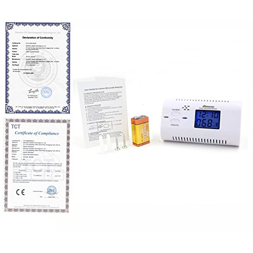 High quality carbon monoxide detector and protect you and your family. The CO detector can be installed on each level of multi level home. It not only protects you and your family against the exposure to Carbon Monoxide, it gives you more confidence and less inconvenience with these amazing features.1:The LCD display shows you a parts per millon (PPM) reading, battery life and 24hour clock. 2:You get voice prompts and an alarm if carbon monoxide levels get too high, and also a low battery voice prompt.3:It uses a single 9v battery which is included and has low power consumption.4;In the very unlikely event the sensor does fail there is an auto detect sensor failure for added peace of mind. 5;Furthermore, we believe you will be very satisfied with our Carbon Monoxide Detector, but if you have any issues let us know. We will do what we can to help. Besides, We have passed the CE & ROHS Certification and meets UL2034 standards.