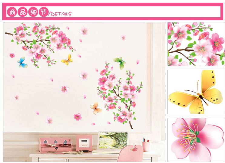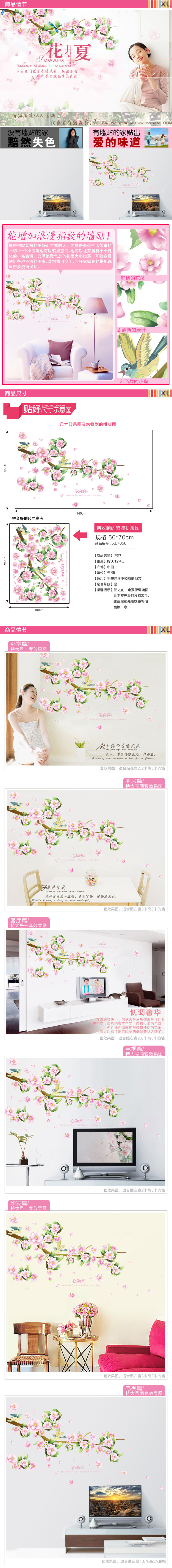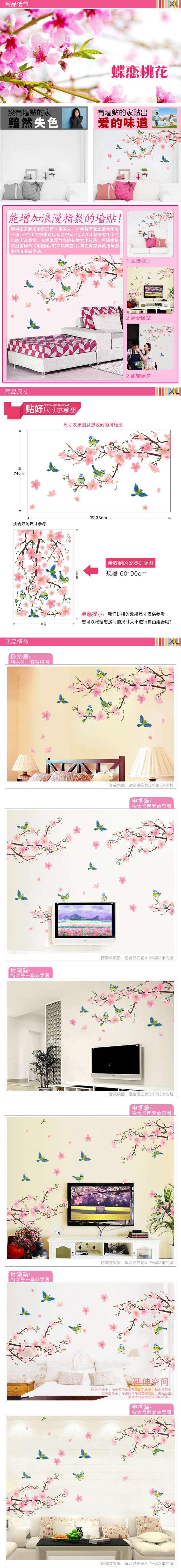 桃花飞鸟墙贴 可移除客厅电视背景墙贴纸卧室浪漫 书房餐厅装饰画