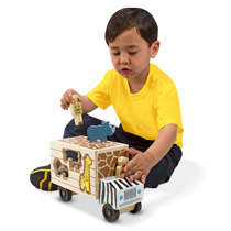 Includes wooden safari truck with slide-up cargo door and die-cut sides, plus 7 wooden animals and 2 wooden people