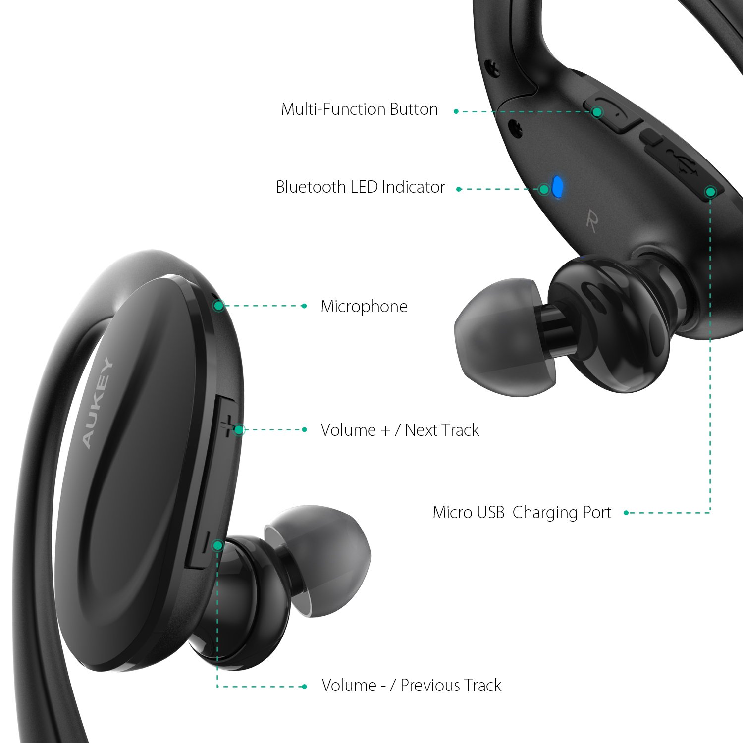 • Package Content: Aukey EP-B4 Bluetooth Headset, USB Charging Cable, 6 x Ear buds (large, medium and small), 6 x Ear hooks (large, medium and small), User manual & Aukey 18 Months worry-free warranty