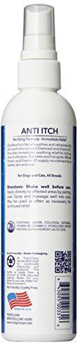-. Feature : Formulated with Bitrix to discourage wound biting / Provides temporary immediate relief for pets with hot spots, scrapes, flea bite dermatitis and dry, flaky skin / Contains Vitamin B5, Oatmeal and Vitamin E to condition skin & coat / Non-stinging formula contains no steroids or alcohol / TropiClean Oxy-Med Itch Relief Spray