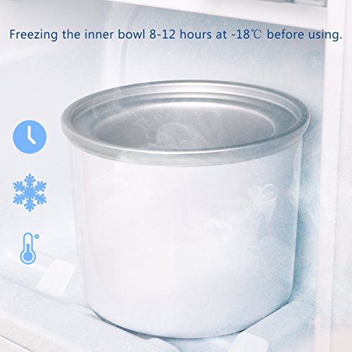 NOTE place the inner bowl into a freezer about 8 hours in advance before using, but pls frost the inner bowl for 12 hours before the first use. The ice cream maker must be switched on before adding ice cream.