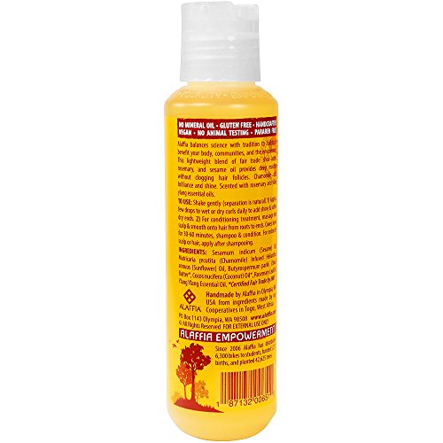 - Feature : 100% Certified Fair Trade Ingredients / Lightweight blend of certified Fair Trade shea butter, rosemary oil and West African sesame oil provides deep moisture without clogging hair follicles. / Keeps waves and loose spirals moisturized, healthy and glowing. / Chamomile flower infusion adds brilliance and shine. / Equality- Empowerment- Beauty. All sales of Alaffia products contribute to empowerment projects to help break the cycle of poverty in Togo.