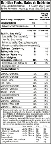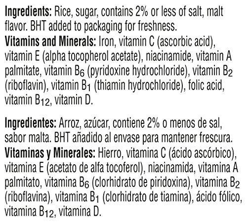 -. Feature : One pack of four, 12-ounce boxes of Kellogg's Rice Krispies toasted rice cereal / Approximately ten 1.25-cup (33-gram) servings per box; 40 servings total / 25% of recommended folic acid and vitamins A, B6, B12, C, and E / 50% of recommended iron / Classic oven-roasted cereal delivers snap-crackle-pop with a load of vitamins