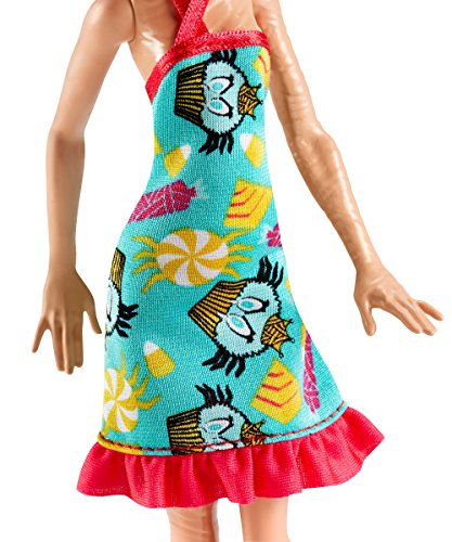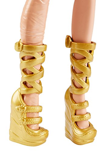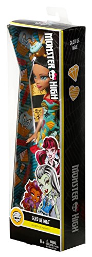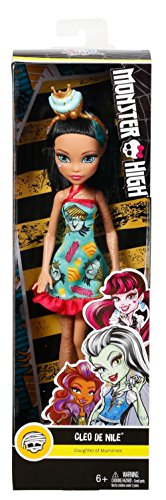 The Monster High dolls look sweet in dessert-themed looks -- treat-decorated hats are the dripping icing on the cake! Cleo de Nile doll, daughter of a mummy, has style wrapped up in a teal dress with a colorful sweets-themed print and red ruffled hem. Golden strap boots complete the regal look. And a large cupcake with blue icing and golden crown makes a regal hairpiece for Cleo de Nile doll. Collect all of the sweets-themed Monster High dolls to satisfy your sweet tooth (each sold separately, subject to availability). Includes Cleo de Nile doll wearing fashions and accessories that include a themed hairpiece. Doll cannot stand alone. Colors and decorations may vary.Feature