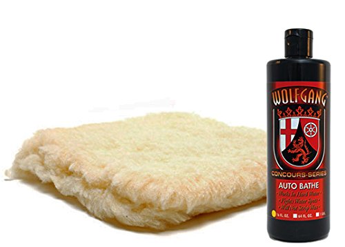 -. Feature : Wolfgang Auto Bathe is a rich, high sudsing car shampoo that pampers even the most delicate paint finishes. This high lubricity car wash lathers your vehicle in paint-protecting foam as it loosens and lifts dirt and grime. Wolfgang Auto Bathe leaves your vehicle looking clean, shiny, and virtually water spot-free. / The Synthetic Sheepskin Wash Pad has all the softness of a traditional sheepskin wash mitt, but without the hefty price tag! Plus, you don't have to wear the Synthetic Sheepskin Wash Pad - a huge plus for a lot of people. The pad provides the same gentle cleaning for your vehicle in a large wash pad. The Synthetic Sheepskin Wash Pad is made of high quality synthetic sheepskin that pampers paintwork and releases dirt. / Directions: 1.Thoroughly rinse the vehicle to remove excess dirt. 2.Pour 1-2 oz. of Auto Bathe in a 5 gallon bucket and dilute with a heavy jet of water to activate suds. 3.For best results, wash vehicle from the top down with a sponge or mitt, rinsing frequently to avoid water spotting. 4.Dry vehicle with a soft microfiber waffle-weave drying towel.