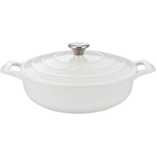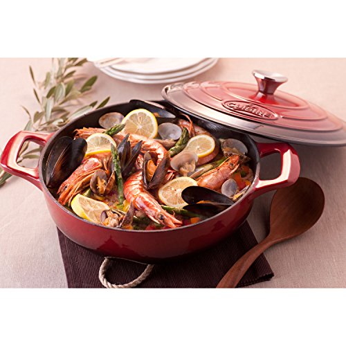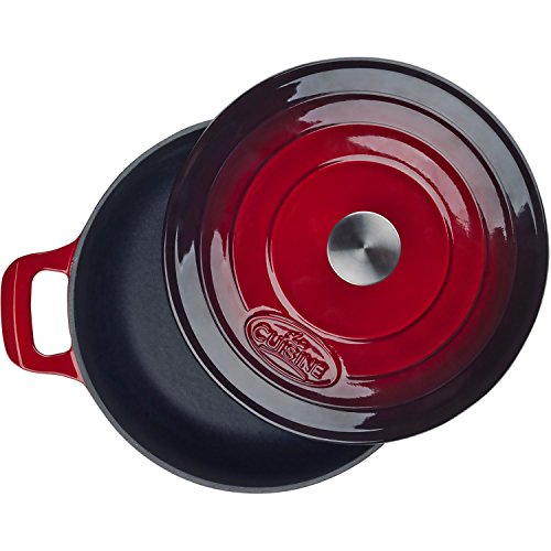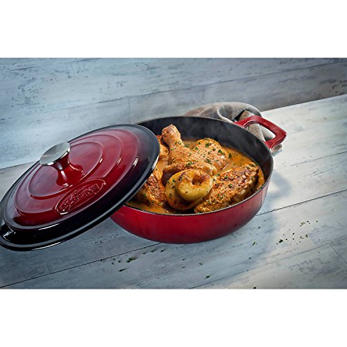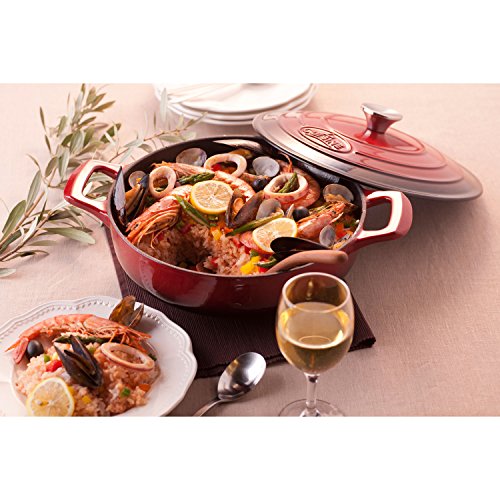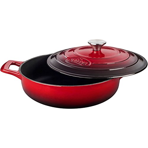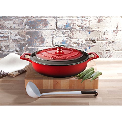 La Cuisine's LC 3100MB PRO Saute 3.75 Qt. Cast Iron Casserole, in red, provides a beautiful presentation for rice or potato dishes. La Cuisine's PRO cast iron cookware is crafted using sand molds, which are used only once, forging a lighter product with a very fine enamel finish that is truly unique. Wonderfully versatile, La Cuisine's PRO saute casseroles are suited to the oven and all cooktops, including induction. Food heats through evenly and remains hot until served. The non-toxic, matte black enamel interior surface is scratch-resistant, stain-resistant, gives excellent food release that improves through continued use, and is simple to clean - just wash in warm water. Perfect for professional and domestic cooks alike, La Cuisine PRO gives you no-fuss, healthy cooking that looks great as it goes straight from cooking on the stovetop or in the oven to serving at the table or buffet (our trivets, sold separately, are recommended for table/buffet use).Feature