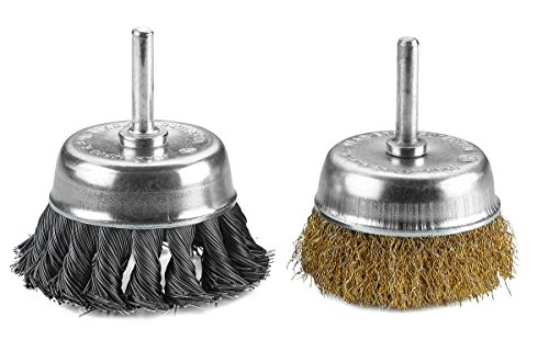 - WHAT IS IT: 1pc 3 Inch brass plated crimped wire cup brush & 1pc knotted steel wire cup brush. Ideal for removal of rust, corrosion and paint. 1/4"" shank fits all drills. Hardened steel wire for reduced wire breakage & long life. Maximum 4500 RPM.