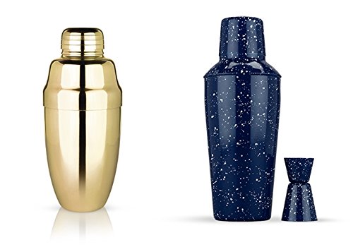 -. Feature : Gold Heavyweight Cocktail Shaker accommodates 500 ml (17 oz) comfortably. 1.35 mm-thick walls. Gold plated / Enamel Cocktail Shaker holds 26 oz and Jigger holds 0.7 & 1.5 oz