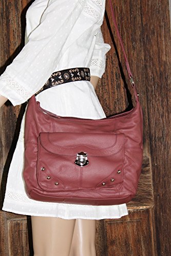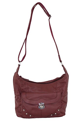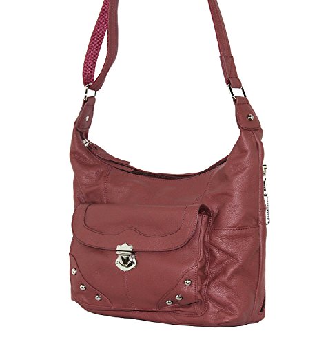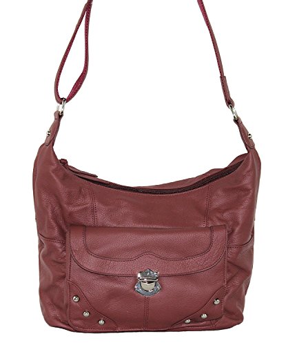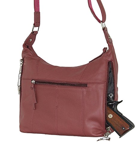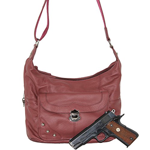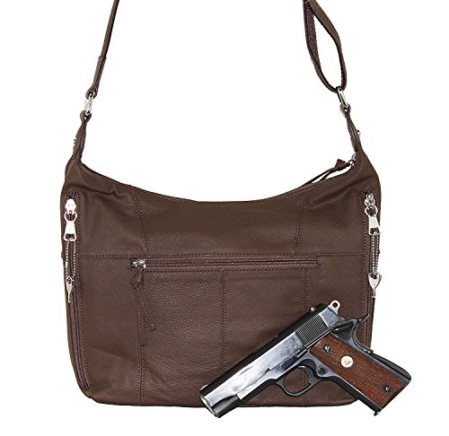 Product Description Beautiful large Goson concealment purse made from sturdy soft pebbled grain cowhide leather. This functional concealed gun handbag has multiple exterior and interior pockets. In the front, a large silver buckle pocket and decorative silver studs. In the back, an ample secure lock YKK zip gun concealment compartment, for right or left draw users, keys included. Along with a handy exterior zip pocket. On the inside the bag is also practical, a roomy, multi-compartment interior, with zip pocket and 2 slide pockets. The bag is attached to an adjustable, wire enforced, leather strap with the minimum drop length of 16in, to maximum drop length of 27in. Purse Measures 14in x 8in x 4in; Exterior buckled compartment measures 9in x 7in; exterior zip pocket measures 8in x 7in; Secure Lock CCW compartment measures 12in x 9in 0