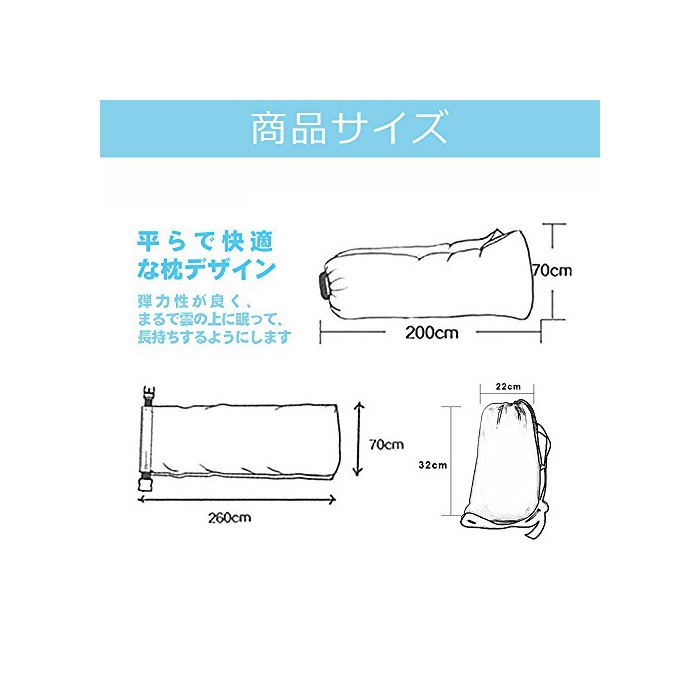 신형 에어 소파: 사용 시 사이즈:가 로 폭260cm / (길이)깊이70cm / 높이50cm-70cm공기량에 의해 변동.수납 시 사이즈:18cm×35cm×10cm 중량 그램:1.3kg