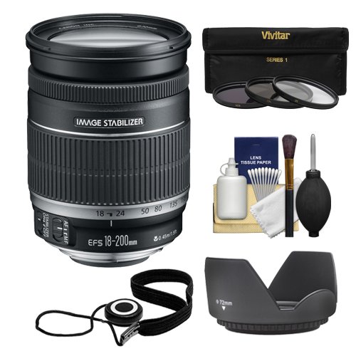 Canon EF-S 18-200mm f/3.5-5.6 IS Zoom Lens with 3 UV/FLD/CPL Filters + Hood + Kit for EOS 7D, 70D, Rebel T3, T3i, T5, T5i, SL1 DSLR Cameras