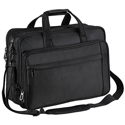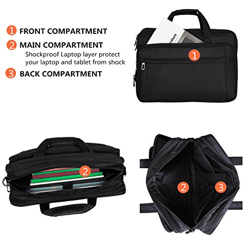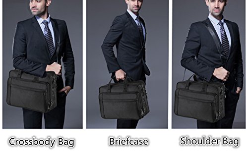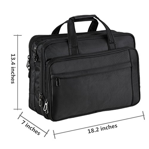 Size: 18.2 x 13.4 x 7.0(9.0) inches; Fits up to 17.3 inches laptop. Weight: 1.4 kg Color: Black Material: Oxford Nylon cloth; 210D waterproof polyester lining Construction: Main compartments designed for keeping laptop or tablet etc, one back pocket with zippers for keeping item like iPad, papers, documents, etc. Front pocket with zipper is convenient for carrying pens, power bank, phones etc.Safe for your items. A luggage belt on back side for fixing the bag to a luggage trolley, comfortable for your trip. Features: Study / Business / Leisure /Travel