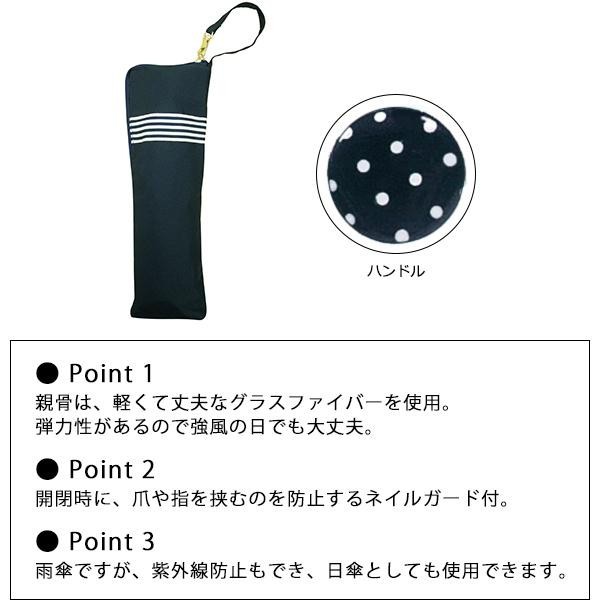 ボーダーテープのリボンがポイントです。ハンドルにもドットがプリントされています。濡れた傘も気にせずカバンにしまうことができる、内生地撥水加工ポーチ付き。 |