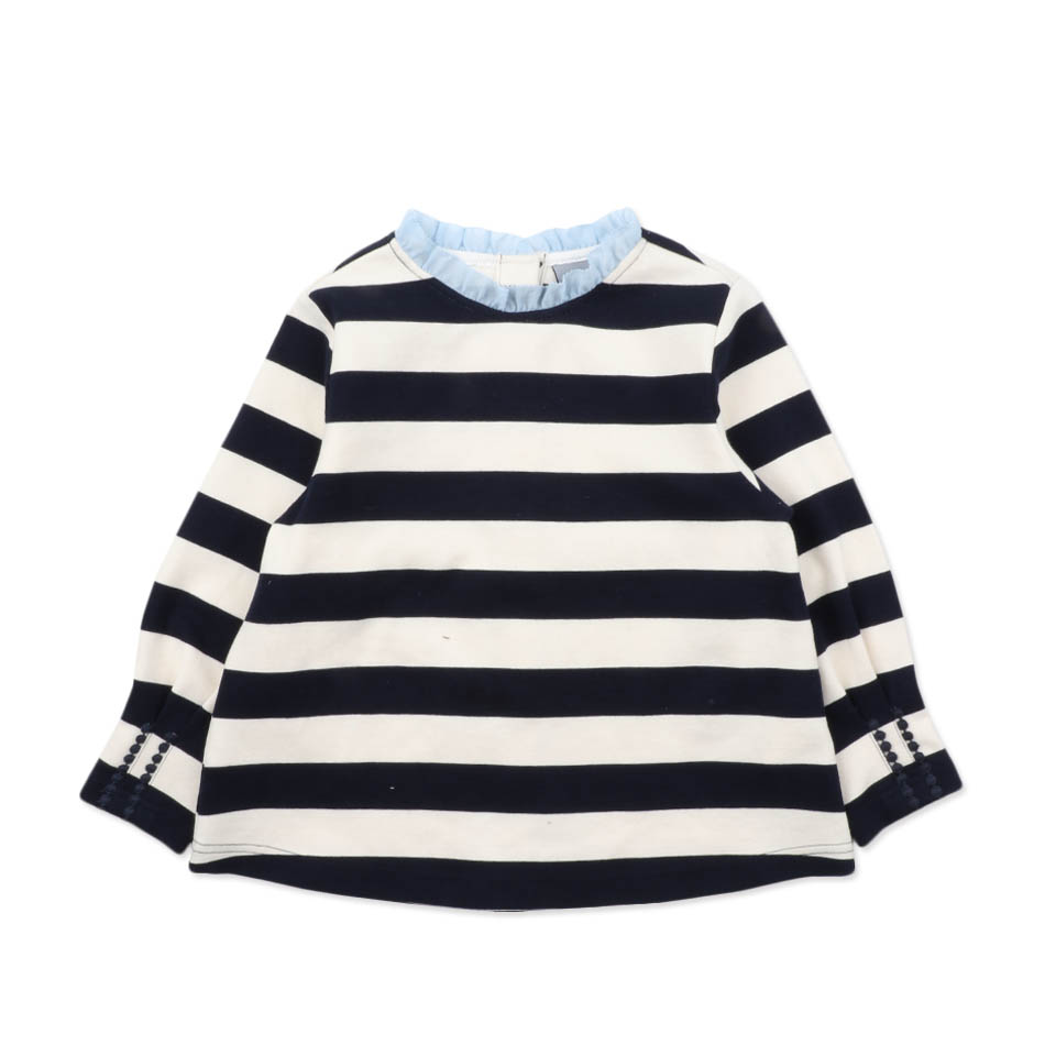 하나만 입어도 타운웨어로 좋은 고시감있는 소재감의 여아 화이트, 네이비 스트라이프 티셔츠입니다.살짝 A 라인으로 스커트나 스키니팬츠, 일자팬츠와 입었을때 스마트한 느낌을 잘 살려주는 간지의 아이템입니다.목에리에 하늘거리는 소재의 스카이 블루 프릴장식 배색과 손목에 주름처리로 여아스러운 느낌을 잘 살린 BEEN 만의 시그니처 아이템입니다.