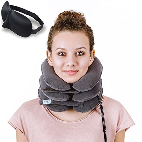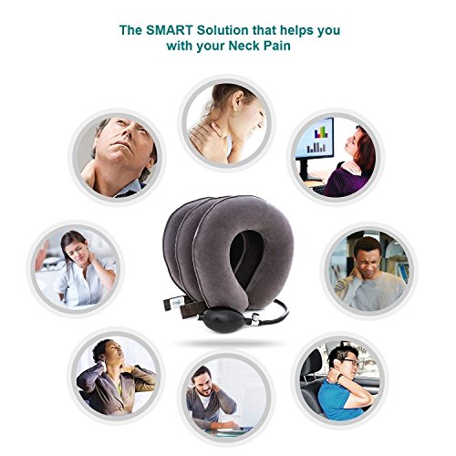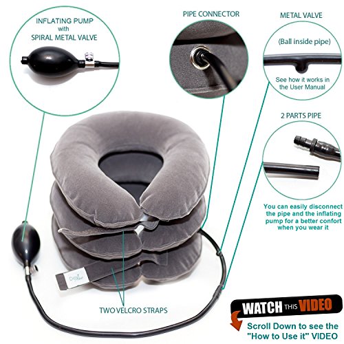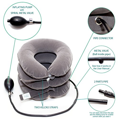 The Inflatable neck traction devices are basically inflated neck braces. You secure them around your neck and use the pump to inflate them.