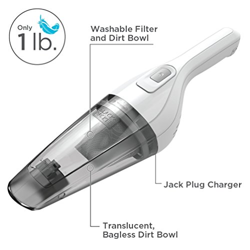 The BLACK+DECKER HNVB115J10 quick clean cordless hand vacuum features lithium battery technology that delivers strong suction, long battery life and cordless convenience. A compact, lightweight design makes this vacuum easy and comfortable to use. The dust bowl twists open for quick and easy emptying. The translucent, Bagless dirt bowl makes it easy to monitor the dirt level inside. This vac features a washable bowl and filter which enable thorough cleaning for optimal performance. Includes: 1) hand vac, 1) jack plug charger.Feature