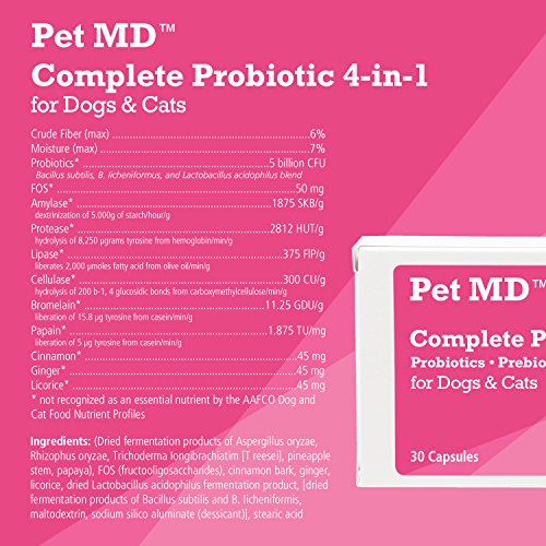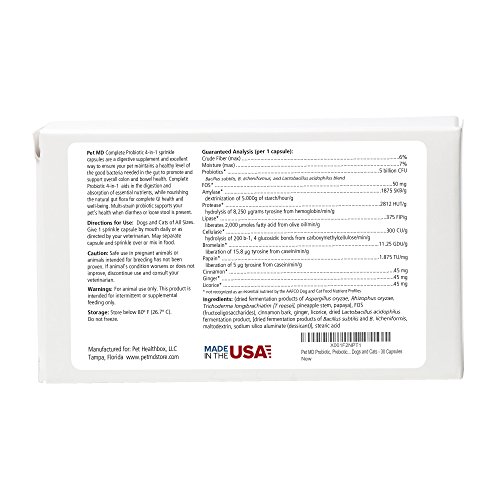 Pet MD Complete Probiotic 4-in-1 is a digestive supplement and an excellent way to ensure your pet maintains a healthy level of the good bacteria needed in the gut to promote and support overall colon and bowel health. Complete Probiotic 4-in-1 aids in the digestion and absorption of essential nutrients, while nourishing the natural gut flora for complete GI health and well-being. Multi-strain probiotic supports your pet's health when diarrhea or loose stool is present.Feature
