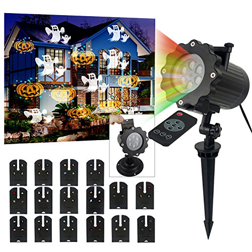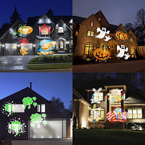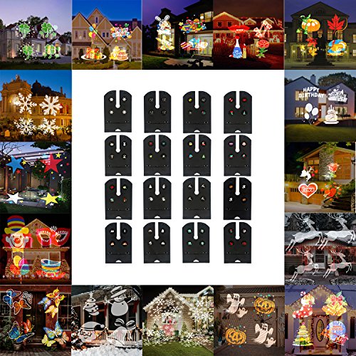 - [Convenient to use]: Come with 5m long power cable and US plug, timing remote control(6-hour on, 18-hour off cycle, or 2hours/4hours/6hours automatic shutdown function), 16 pcs replaceable lens can accent you home and easily decorate for every season.Removed the groud stake, you can place it on the ground .Place light approximately 15-50? from the projection surface to adjust lighting angle achieve better projection effect.