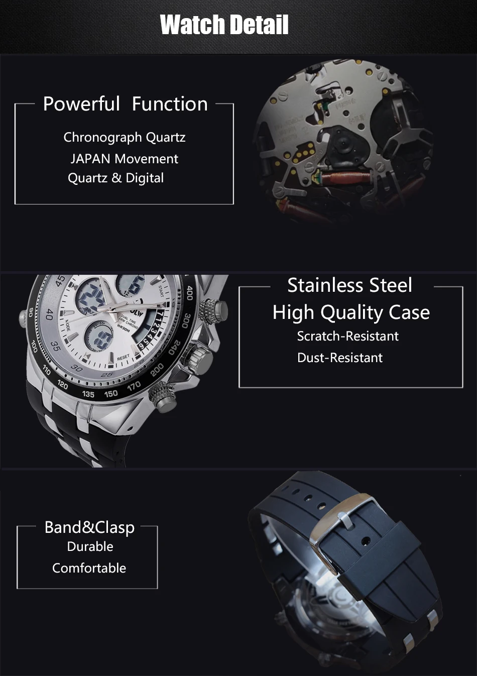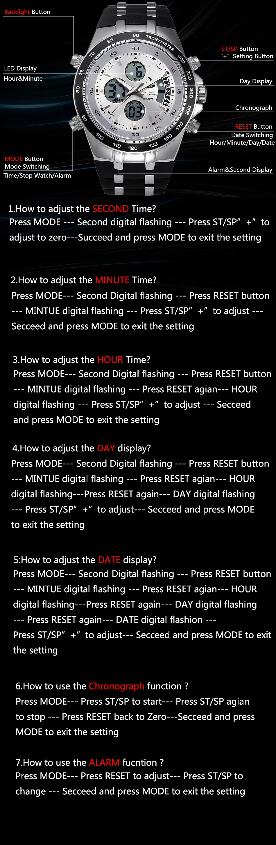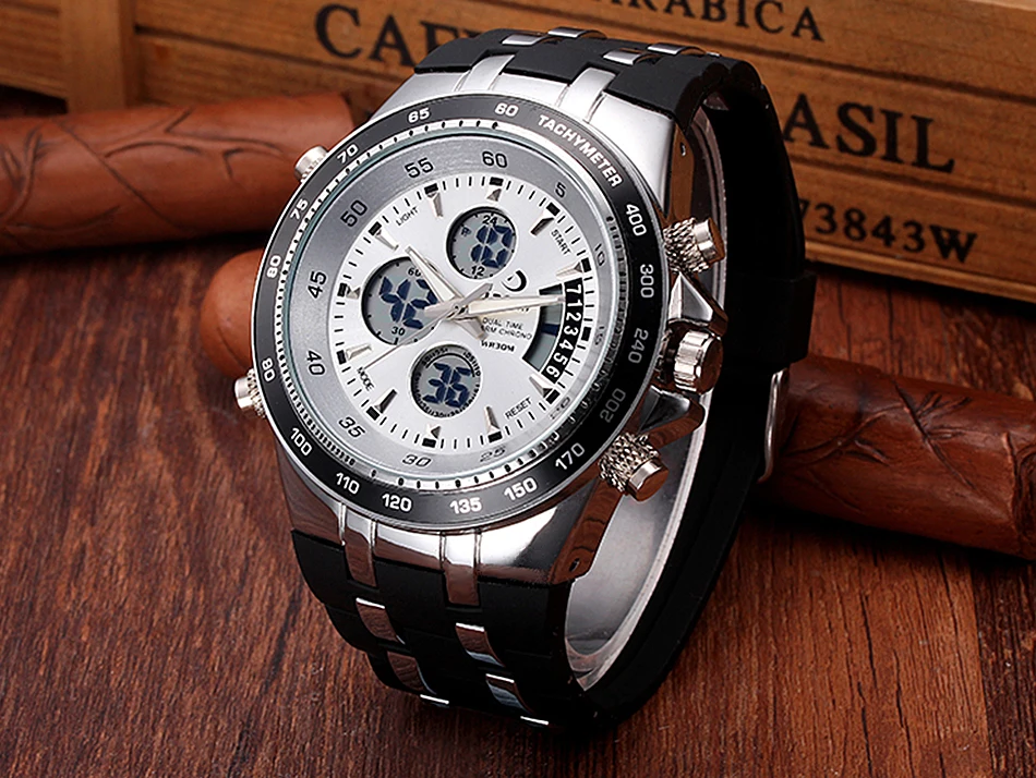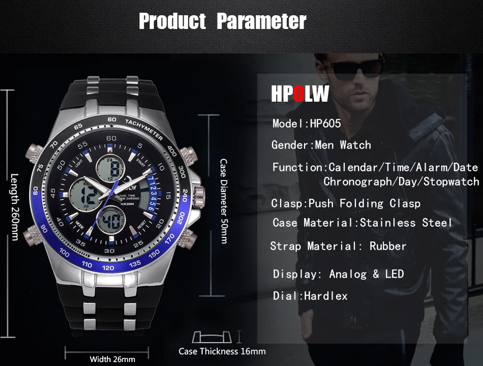 Feature:Water Resistant,LED display,Luminous,Multiple Time Zone,Stop Watch,Back Light,Complete Calendar,Shock Resistant,Chronograph,Luminous Hands,Auto Date,Week Display,Anti-magnetic,Alarm