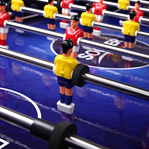 Feature: Strong wood construction and solid steel rods. 8 rods are included within the table to allow 4 rows per team; 11 red players and 11 yellow players Equipped with ball serve cups for convenience. Internal ball retrieval at each goal. Plastic manual slide scorers at each goal. Unified leg panel design with leg spanners on each side. Scoring device to count the game process conveniently. Two footballs included. Specifications: Material: MDF frame steel rods Colors of Polo shirt: Red Yellow Overall Dimension: 48" x 24" x 31"(L x W x H) Unit Weight: 30.8lbs Package Includes: 1 x Foosball (Assemble is required) 8 x steel rods. 11 x red players 11 x blue players 2 x footballs 1 x Instruction