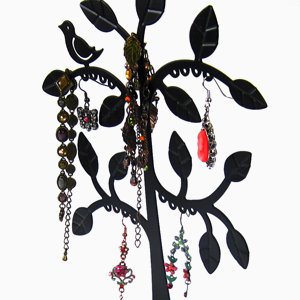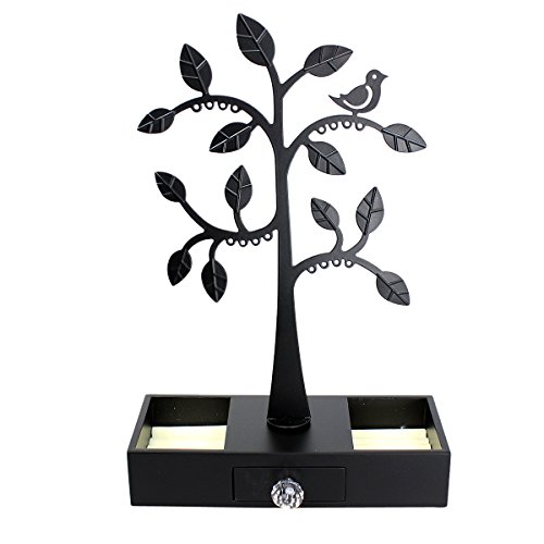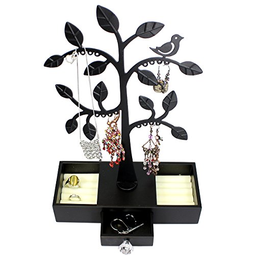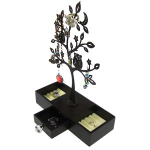-. Title : Metal Bird Tree Atop Wood Jewelry Box with Drawer Earrings & Rings Organizer