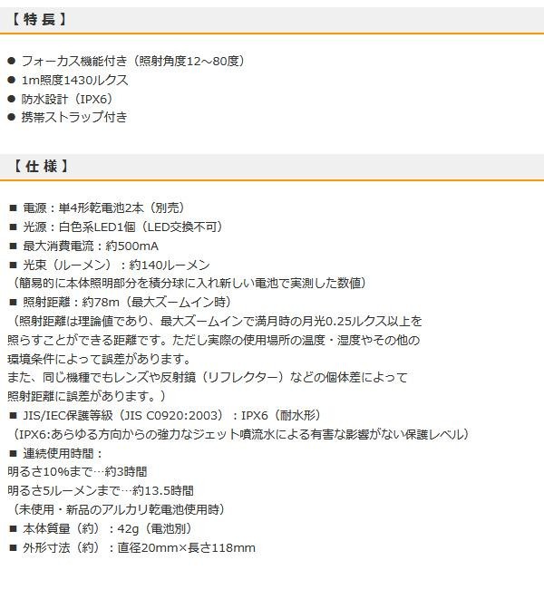 フォーカス機能(照射角度12~80度)付きの防水LEDズームライトです。 製造国:中国 付属品:ストラップ×1 ※サプライヤー直送品 ※2019年2月中旬入荷分予約受付中【商品名】オーム電機 OHM 防水LEDズームライト 140ルーメン LDA-Y2WZ-S
