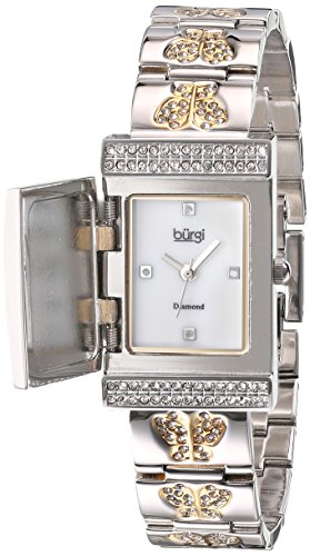 Studio : Burgi Publisher : Burgi Binding : Watch Product Description This Burgi ladies rectangular Mother of Pearl watch has four diamond hour markers. The watch features a cover, embellished with a butterfly and crystals. The butterflies on the bracelet finish this fine timepiece. 0