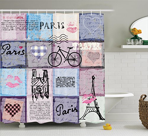 Apartment Decor Shower Curtain Set By Ambesonne, Grunge Textured Retro Collage Of Paris With Famous Object Eiffel Tower European Home Decor, Bathroom Accessories, 69W X 70L Inches, Multi