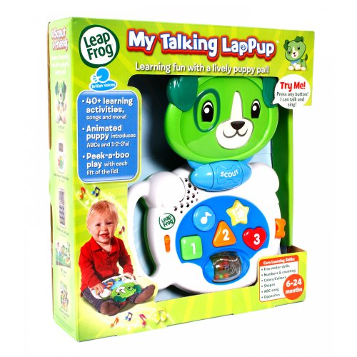The LeapFrog My Talking LapPup Scout makes learning fun with a lively puppy pal for your little one. This LeapFrog My Talking LapPup features more than 40 songs and activities with an animated puppy pal to help your baby explore shapes, colors, counting, opposites and even peek-a-boo play.Feature