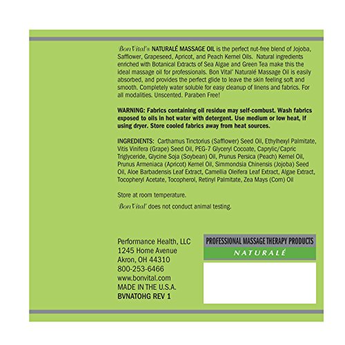 Studio : TheraBand Publisher : TheraBand Binding : Misc. Product Description Bon Vital´ Naturale Massage Oil - is the perfect nut free blend of Jojoba, Safflower, Grapeseed, Apricot, and Peach Kernel Oils. All natural ingredients enriched with Botanical Extracts of Sea Algae and Green Tea make this the ideal massage oil for professionals. Bon Vital´ Naturale Massage Oil is easily absorbed, and provides the perfect glide to leave the skin feeling soft and smooth. Completely water soluble for easy cleanup of linens and fabrics. For All Modalities. 0