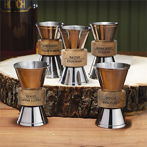 -. Brand : Two's Company -. Feature : Each sold separately / Holds 1 and 1.5 oz / Stainless Steel/Teak Wood -. Label : Two's Company -. Manufacturer : Two's Company -. ProductGroup : Kitchen -. ProductTypeName : KITCHEN -. Publisher : Two's Company -. Studio : Two's Company -. Title : Mixed Messages Double Sided Jigger in Gift Box