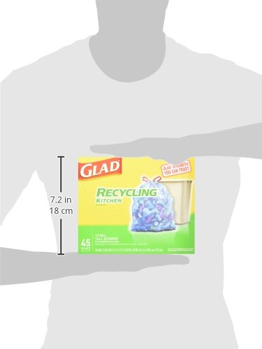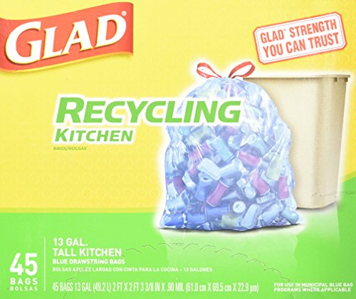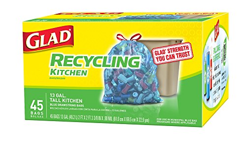 -. Binding : Health and Beauty -. Brand : Glad Indoor Trash -. EAN : 0012587785423 -. Feature : 45 count box of 13 gallon recycling trash bags / Blue garbage bags will handle your recyclables and keep your kitchen bin clean / Strong drawstring closure makes closing easy and dependable / Blue bags for use in municipal blue bag programs where applicable / Drawstring bag in a 13 gallon size fits tall recycling bins -. Label : Clorox Company -. Manufacturer : Clorox Company -. NumberOfItems : 1 -. PackageQuantity : 1 -. ProductGroup : Pantry -. ProductTypeName : HEALTH_PERSONAL_CARE -. Publisher : Clorox Company -. Studio : Clorox Company -. Title : Glad Recycling Tall Kitchen Drawstring Trash Bags, Blue, 13 Gallon, 45 Count -. UPC : 012587785423