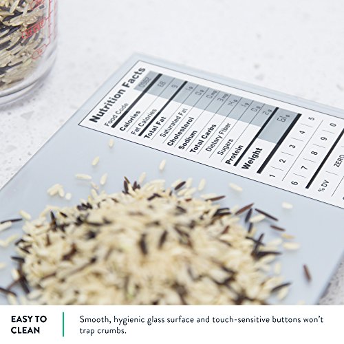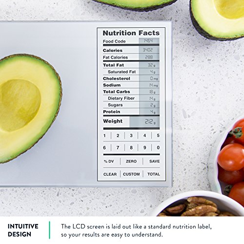 PRODUCT DETAILS: View nutrition facts for 2,000 foods in the scale's built-in database, and create up to 99 more custom entries. Scale shuts off and calibrates automatically. Smooth surface is easy to clean. Durable tempered glass top supports up to 11lb/5kg. Tare/Zero function allows you to measure messier ingredients in a bowl. Non-slip, scratch-resistant feet. Switch between grams or pounds & ounces. 4 precision weighing sensors ensure accuracy within .1 oz/1 gm. 3 AAA batteries (included).