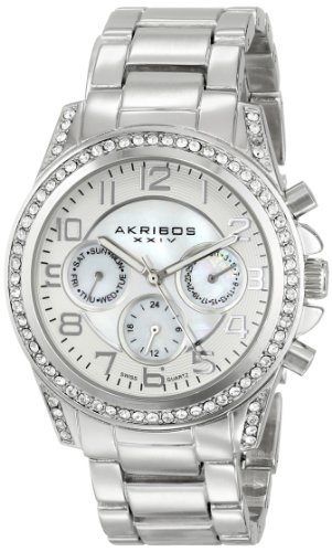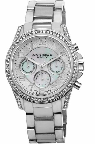 Studio : Akribos XXIV Publisher : Akribos XXIV Binding : Watch Product Description This elegant Akribos XXIV women's bracelet watch features a round case with genuine crystals on the bezel. It has a Mother-of-Pearl inner dial and luminescent hands. The Swiss quartz multifunction movement displays the day, date, and GMT (24 hour) on Mother-of-Pear sub dials. 0