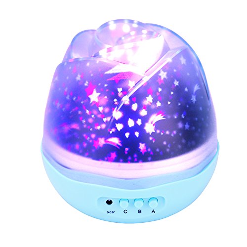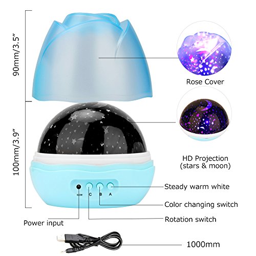 -. Feature : 3 MODEL & 8 LIGHT color - A MODE:The Nightlight light (hard warm light), Press A again would shut off A lamp model; B MODE:Switch for the light color, press B Button 9 times in a row; C MODE: Control the rotary switch, press C again would shut off the rotation. The eight colors have monochromatic colors and combination colors. The buttons are independent, means you can press C as well when you are changing the light color. Various lighting mode can maximize your satisfaction. / 3 types of charging & portable - Projector can be battery powered (not include), can also use the USB cable to connect to your computer, also can connect with DC with your USB converter. Thus it can be used in places where there is no power. The light itself is very light, convenient to carry , it's a ideal item for decorating wedding, birthday, parties. Great for romantic night lamp and decoration light ! it will create romantic and warm atmosphere anytime and anywhere. / QUIRT & CLEAR - The product adopts high quality motor, the quiet rotation (less than 30dB) and the romantic atmosphere create an enjoyable and relaxing bedtime experience for children, soothe and comfort kids to sleep, as the clear slide helps us getting closer to the moon and stars, peace and smart, and give your child a good night's rest with this night light for kid's room. Also perfect for adults to attain a relaxing and calming effect. / DURABLE HIGH QUALITY & FLOWER SHAPED COVER - Projection lamp shade material - PVC, Body material - ABS Environmentally friendly materials. This star projector is created with an LED lamp projector and constructed of plastic. This is highly recommended among consumers who own it due not only the gorgeous view it provides, but also because of the high quality construction and durability it offers. / DON'T HESITATE - Maybe you can buy a mood light looks or works similar with a fewer dollars, but maybe the battery connection will leak, lamp cap will fall, and would you like constantly buy batteries to let it eat through like candies? So buy the rest assured product is the most cost-effective way! We can give a worry-Free Guarantee. 90 days refund or replace for no reason. Problems will be solved as soon as possible . Please feel free to contact us if there are anything we can do for you.