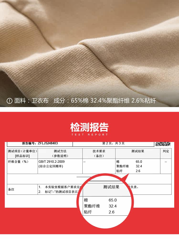 | 面 料:65%棉 32.4%聚酯纤维 2.6%粘纤 罗纹:98%棉 2%氨纶颜 色:米色 |