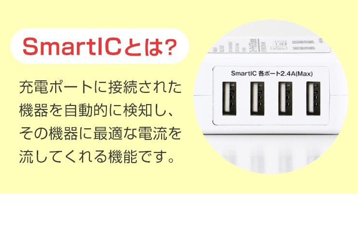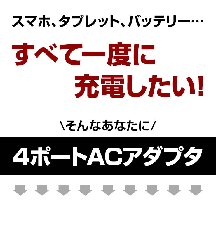 4ポート搭載のUSB ACアダプタが登場!スマホにタブレット、バッテリーなどを一度に充電が可能に!●各ポート最大出力2.4A で急速充電!※全ポート最大出力は5.4Aとなります。●入力電圧100-240Vで海外での利用も可能!(コンセント形状が同じ場合に限ります)※その他の形状は海外変換アダプタ等が必要になります。●プラグ部分が180回転しACアダプタへ収納OK!持ち歩きに邪魔にならない!●コンセント火災を防ぐ、絶縁カバー付き!●安心の国内電気用品安全法認証済!品質保証のPSEマーク! 製品仕様 入力:100-240V 0.6A出力:5V 5.4A(TOTAL)サイズ:約60×66×29.5mm重量:約109gお買い上げから3ヵ月間保証(初期不良のみ)デジキン