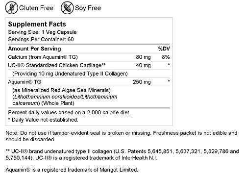 -. Feature : Undenatured type II chicken collagen / A true breakthrough in joint health. Promotes joint mobility & flexibility* / Works with immune system* / Enriched with red algae minerals / Serving size: 1 veggie capsule. Servings per container: 60. Gluten free, Soy free, Sugar free