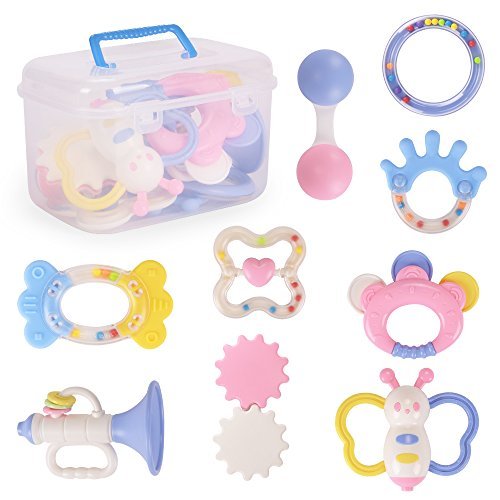 9pcs Rattles & Teethers- 9 pieces of baby rattles are included. Different rattle shapes: Gears, horns, dumbbells, candy gums, bees, small hand gums, heart-shaped, circles, tambourine.