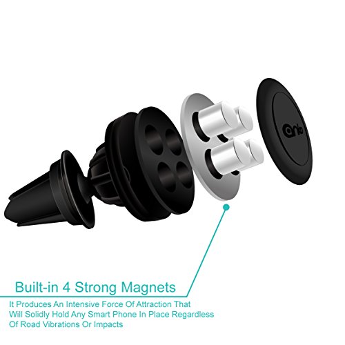 HIGH QUALITY RUBBER CONSTRUCTION, The high quality rubber construction of the base of the mount is unique and very functional as well. It guarantees that the base of the mount will solidly hold the magnetic head of the mount, to help keep your cell phone in place, regardless of road vibrations or impacts. The base of the magnet mount remains fixed into the air vent slats of your car and does not move allowing you to choose the best position for you.