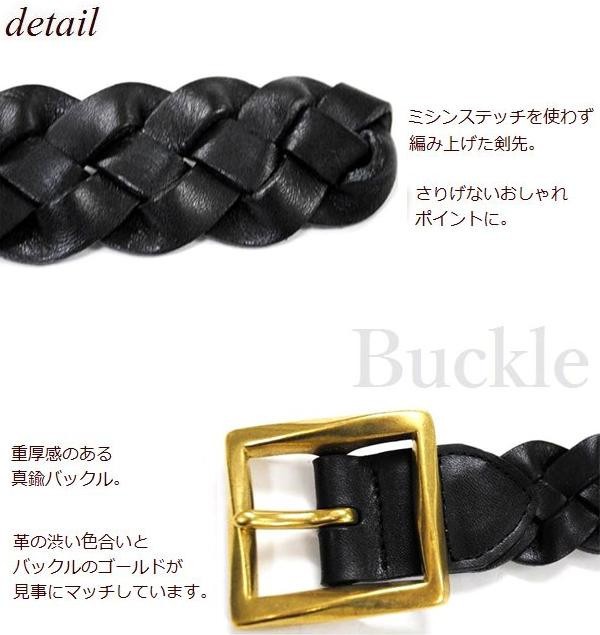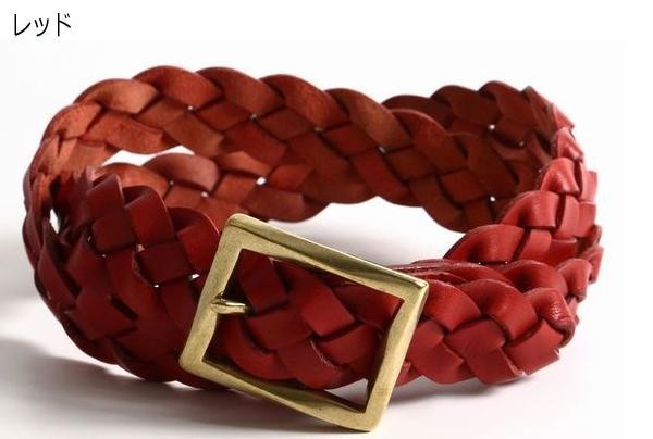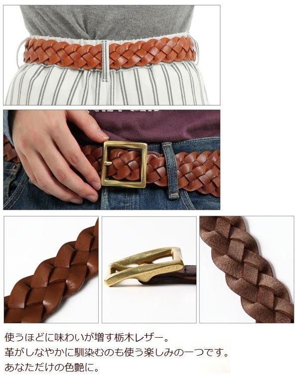 ミシンステッチを使わず編み上げた商品です。男性でも女性でもご使用いただけるデザインになっています。太編みで革の上質感を堪能できるベルトです。 |