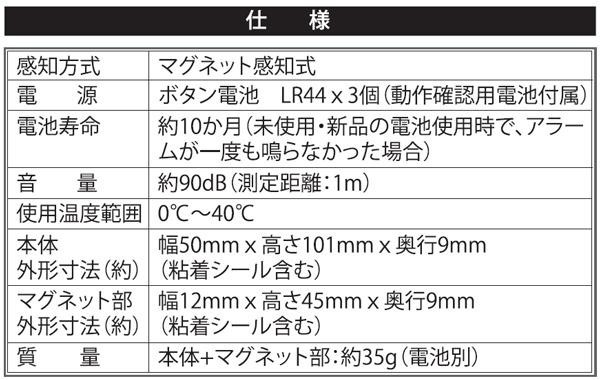 | 窓やドアが開くと大音量アラームでお知らせ、約90dB(測定距離:1m)のアラームが約20秒間鳴ります。本体の厚みは約9mmと薄型なので、ほとんどの窓に取り付け可能です。粘着シールの貼り付け面に「24時間警戒中」の文字がプリントされていますので、透明ガラスに貼り付けると外側から警戒文字が見えて、防犯に役立ちます。凸凹ガラスにも取り付け可能です。スイッチをオンにすると、セット確認ランプが3回点滅し確認音が鳴ります。 |