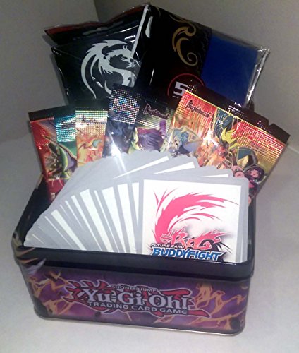 -. Feature : Great Future Card Buddyfight Bundle / Comes with a Yugioh Tin to store your cards / 6 Booster packs / Deck box Sleeves / 60 Random Buddyfight Cards in addition to everything above