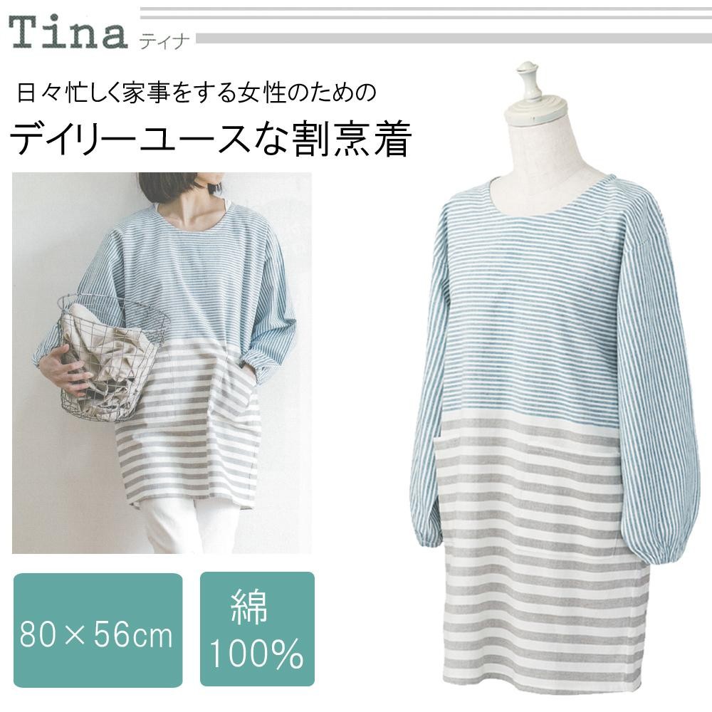 色と幅の違うボーダー柄デザインが可愛い割烹着です。日々忙しく家事をする女性におすすめです。 製造国:インド 素材・材質:綿100% 商品サイズ:着丈:約80cm、身幅:約56cm、袖丈:約25cm、裾幅:約55cm 重量:260g ※サプライヤー直送品 ご注文後3~4営業日後の出荷となります【商品名】ティナ カッポウギ BLUE・464625