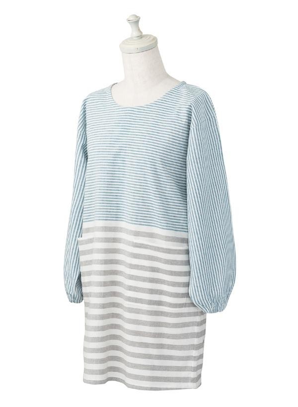 色と幅の違うボーダー柄デザインが可愛い割烹着です。日々忙しく家事をする女性におすすめです。
