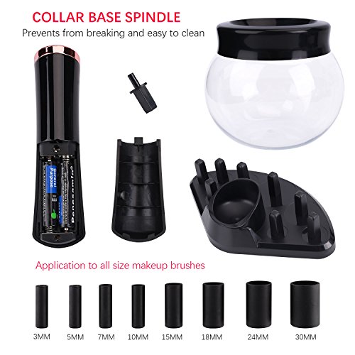 - SO EASY, SO CLEAN, SO FAST: Start with fitting the cosmetic brush to the right collar. Push the spinner to the bottom of the collar, then, attach the spinner to the machine. Warm water and any antibacterial soap can be used as your cosmetic makeup brush cleaner solution. Point the brush down towards the cleaning solution. Pull the tool up to make your makeup brush cleaner as a dryer.